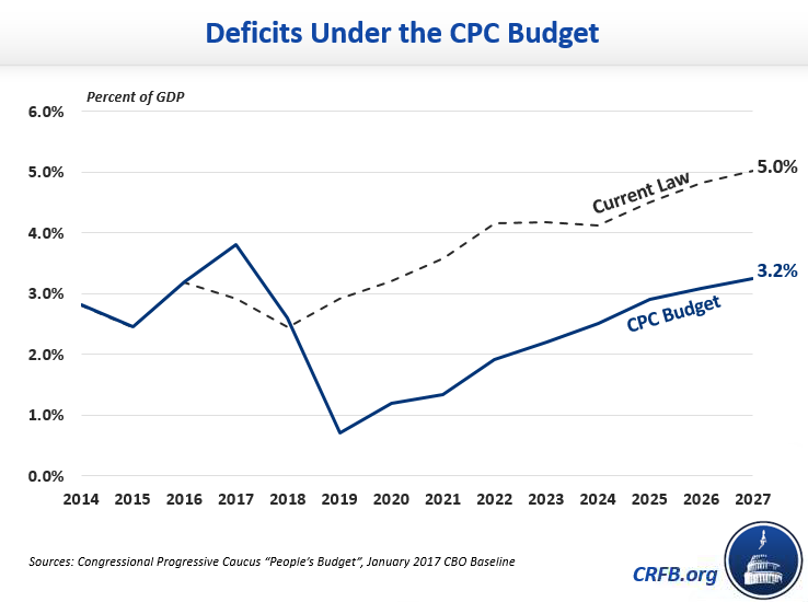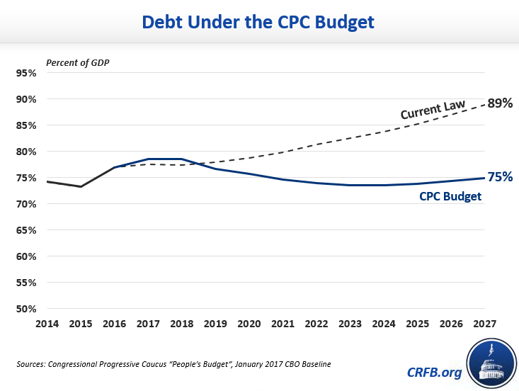 The CPC's budget proposes both higher taxes and higher spending in most areas. It calls for $9.6 trillion of gross savings and $6.6 trillion in investments and other costs over ten years, resulting in $3.0 trillion of deficit reduction over the next decade, including interest savings. This deficit reduction would roughly keep debt constant from today's level of 77 percent of Gross Domestic Product (GDP) to end at 75 percent of GDP in 2027. By contrast, the Congressional Budget Office (CBO) baseline projects that debt will rise to 89 percent by 2027.